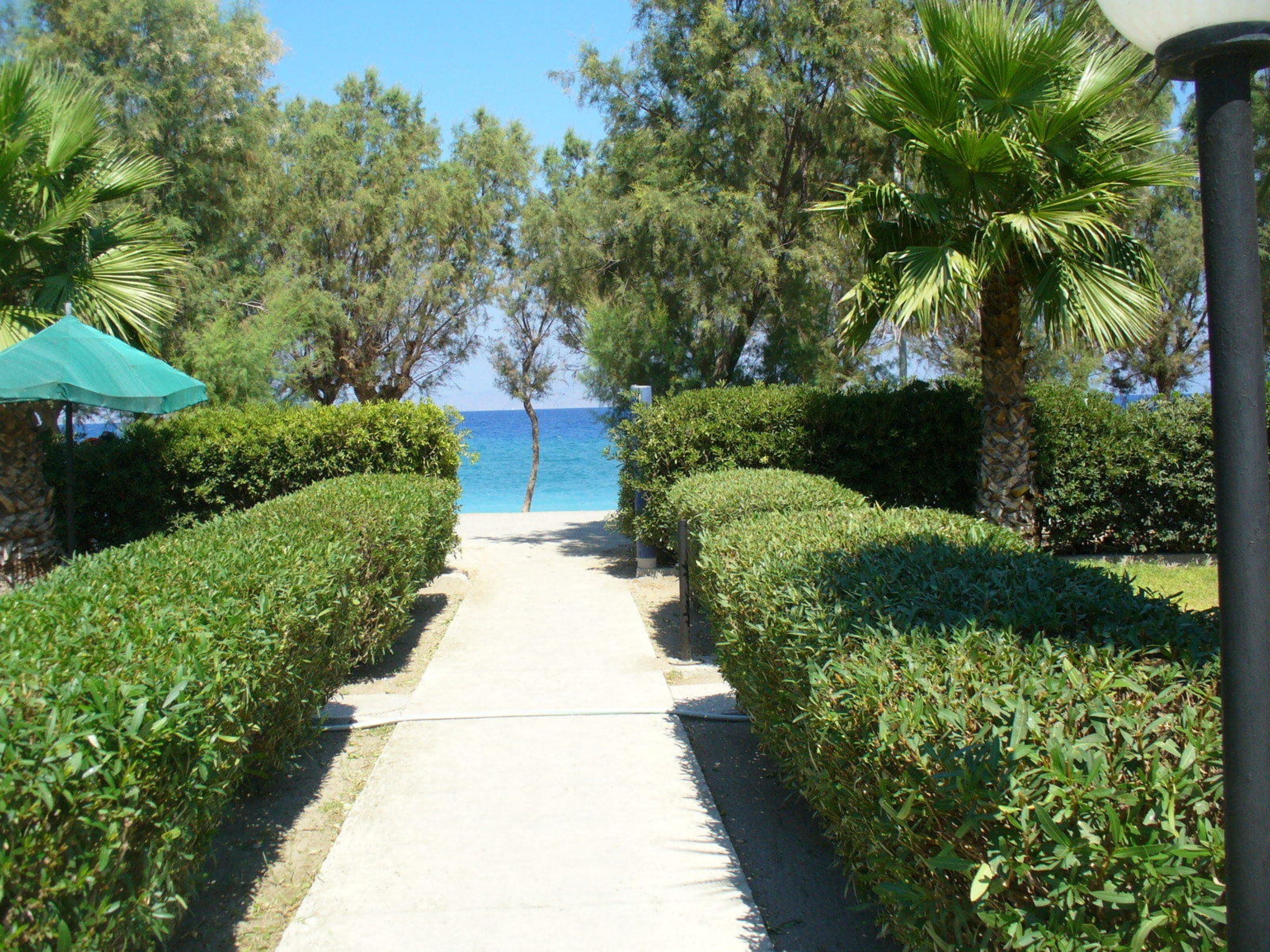 Ogród hotelowy a na końcu Morze Egejskie