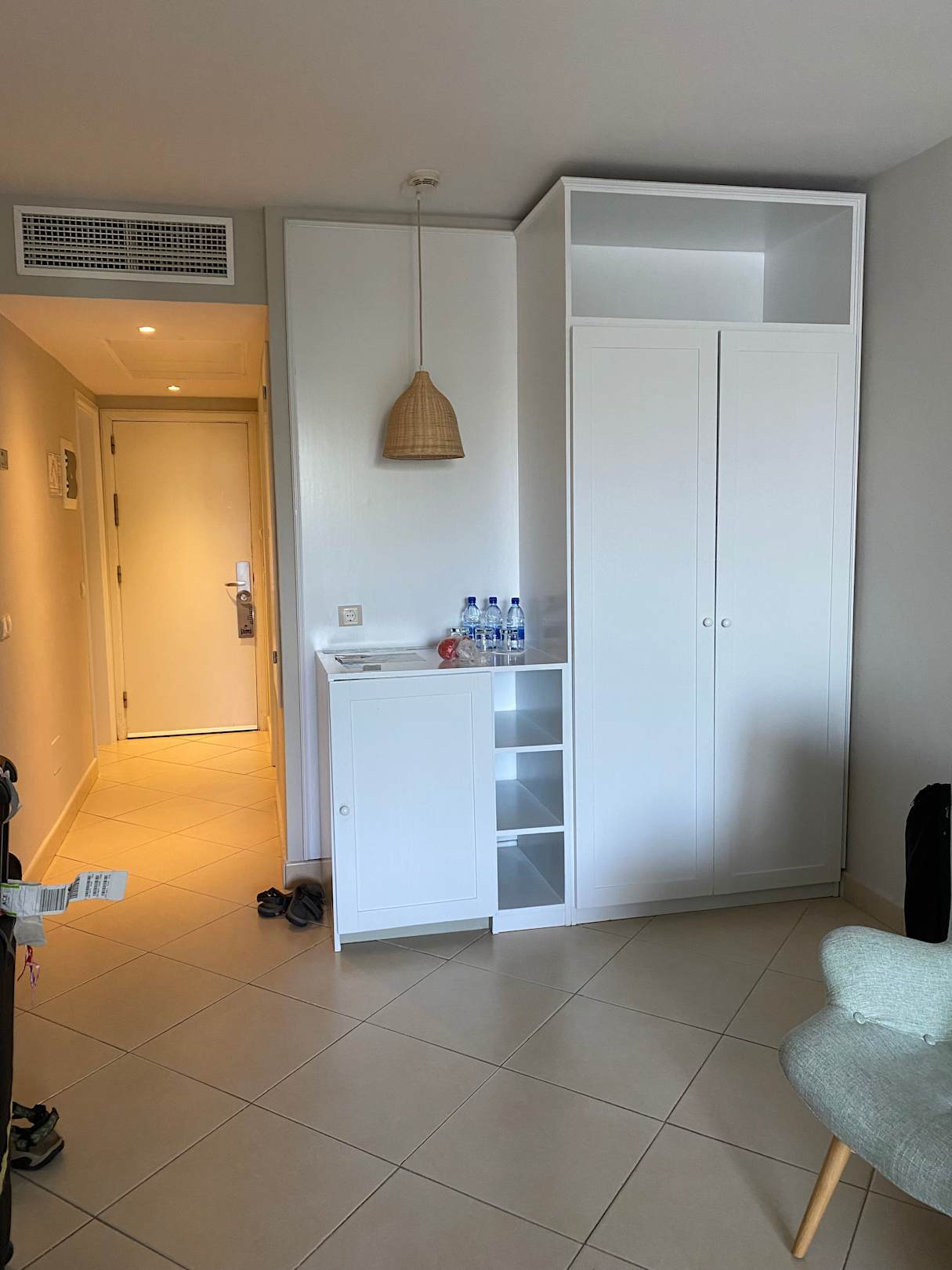 Wohnbereich Ansicht zum Kleiderschrank und Kühlschrank