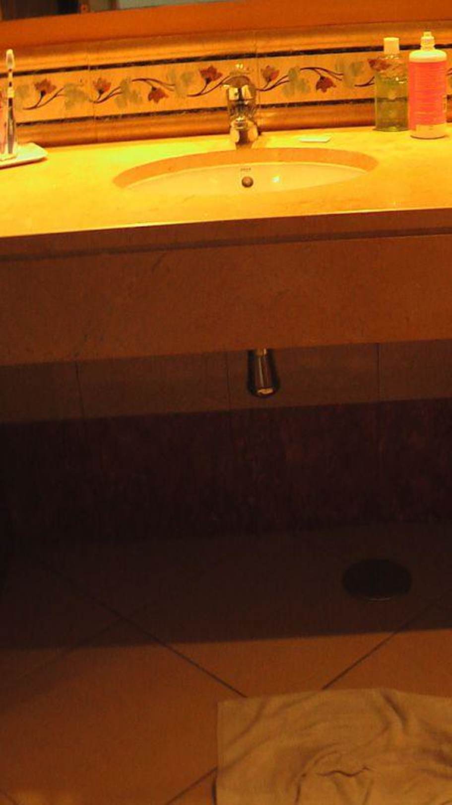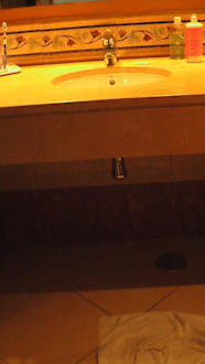 Hohes Marmorwaschbecken im Badezimmer: Für ein Kind unerreichbar = sehr frustrierend für ein fast vierjähriges Mädchen, wenn es zu Hause alleine auf die Toilette geht und Hände wäscht.