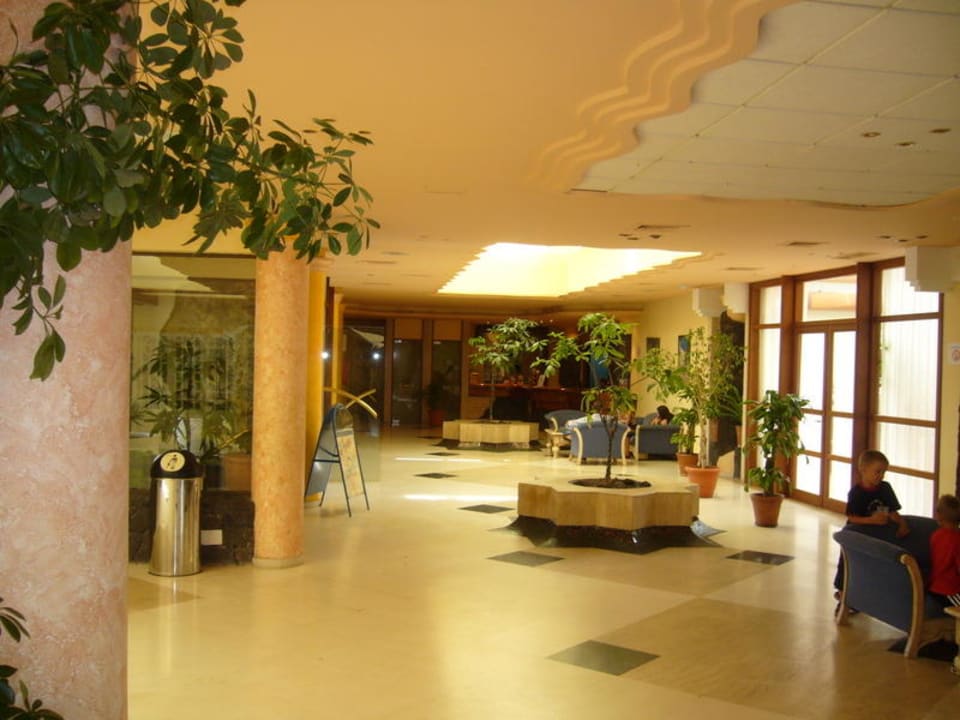 Links der Eingang. Hinten der Empfang. Rechts das Restaurant, oben.