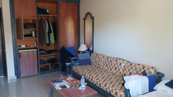Wohnbereich mit Kühlschrank und unbequemer Couch