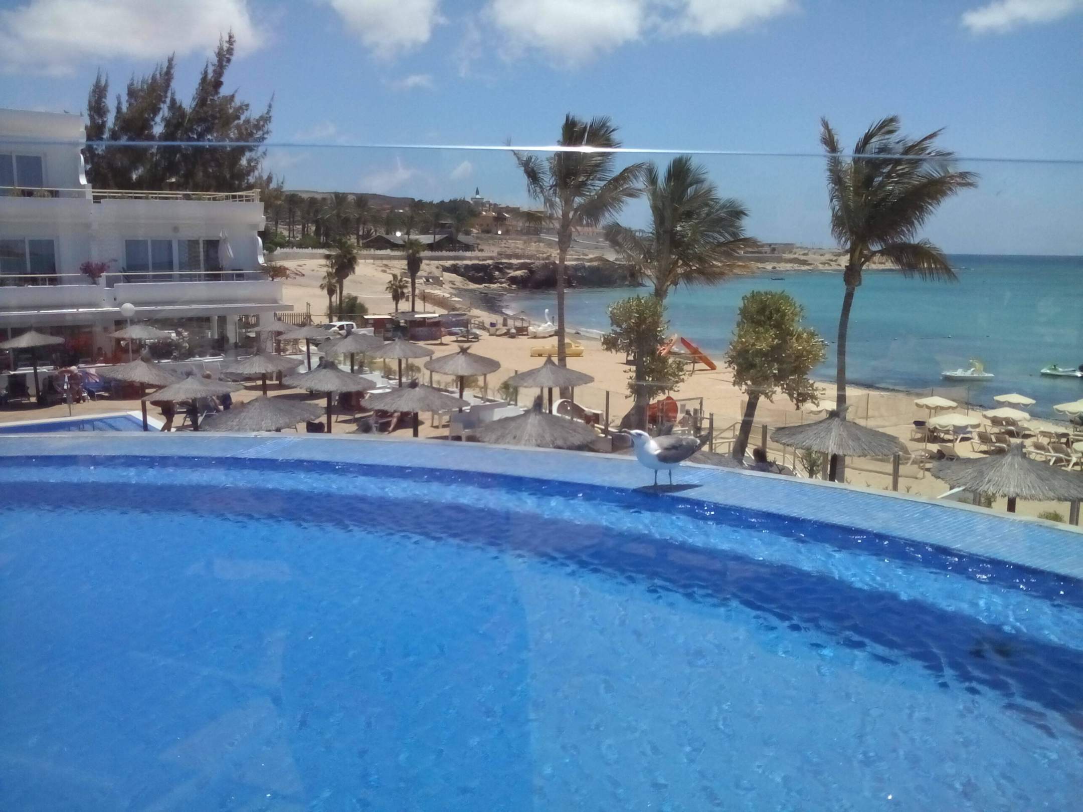 Auf dem Dach der Poolbar befinden sich Sonnen Liegen mit Blick zum Pool und auf sich dahinter befindende Meer. Hier kann man das Wasser sehen welches dann in den Pool herabfällt.