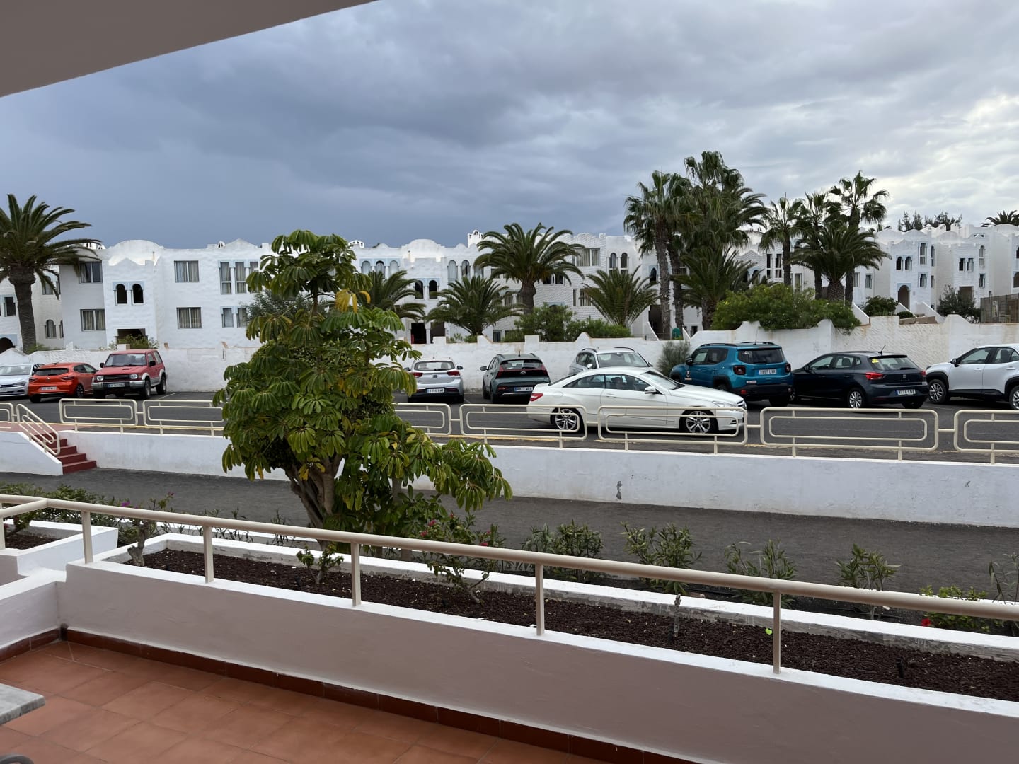 Terrasse und Ausblick aus Zimmer 1205. Weg, Straße und Parkplatz nur ca. 10-20 m entfernt und keinerlei Sichtschutz vorhanden!! Wer nicht auf dem Präsentierteller sitzen oder liegen möchte, sollte Zimmer der Blöcke 1 und 2 vermeiden!
