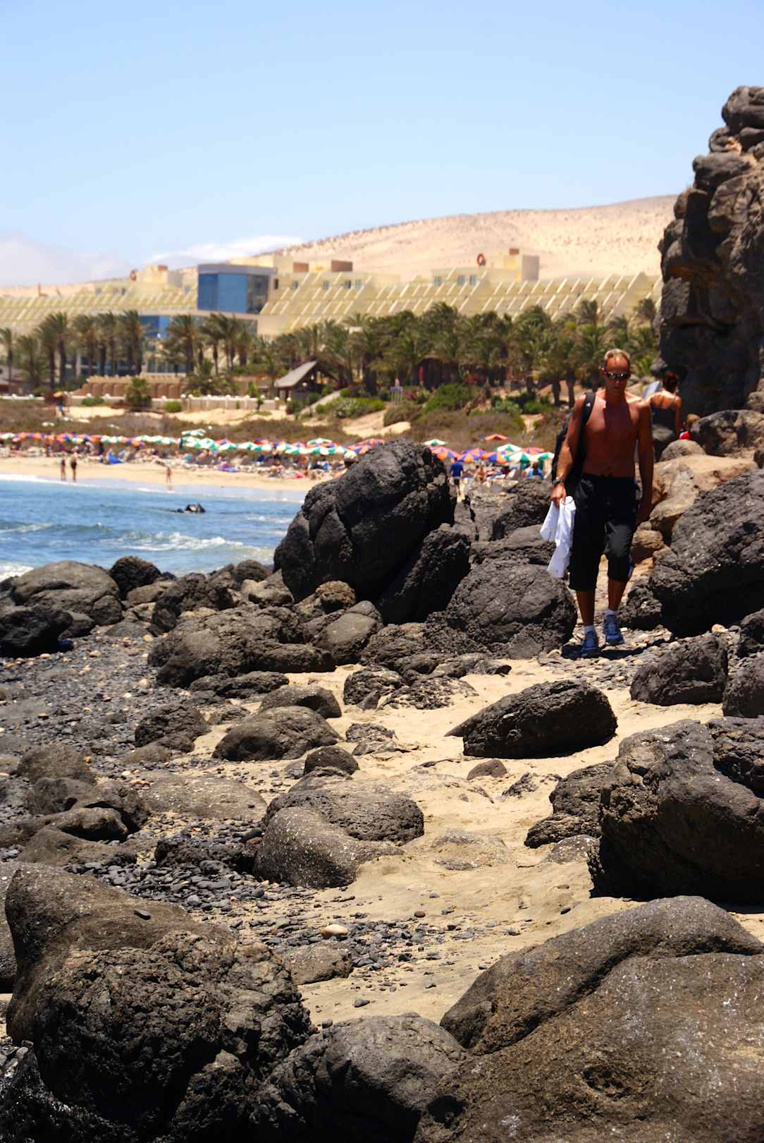 Zum Sandstrand muss man über diese Felsen kraxeln! Auf dem Bild herrscht Ebbe. (Die Sandstrandfotos hier können definitiv nicht vom Strand direkt am Hotel stammen!)