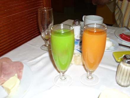 Zum Frühstück hatte man die Wahl zwischen 4 verschiedene Fruchtsäfte und Tomatensaft.