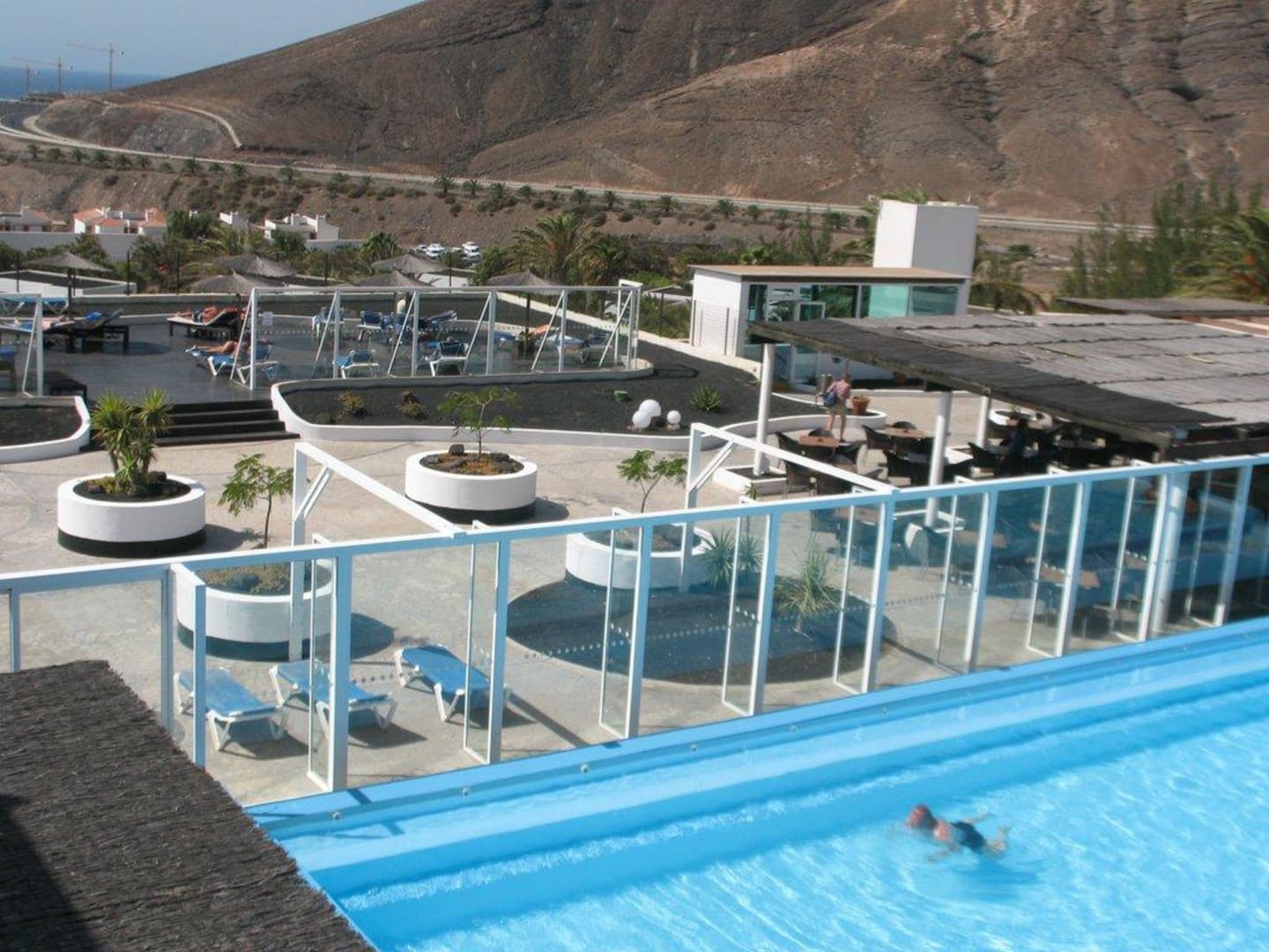 Bilck auf den Relaxpool mit Liegeflächen und der Bar.