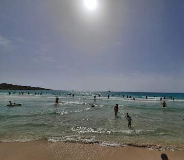 Strandlage, wenn man dem Weg vom Hotel zum Strand folgt. Hier gibt es direkt Sonnenschirme und Liegen. 2 blaue Liegen und ein Schirm kosten 18 Euro. An dem Schirm ist ein Safe befestigt, den man dann nutzen kann