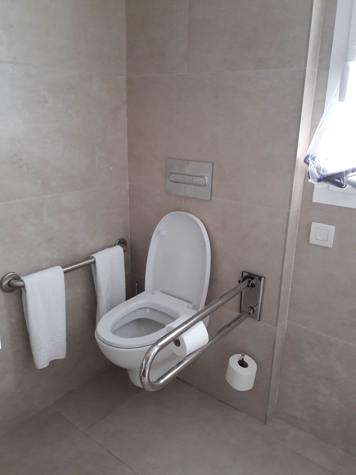 WC - sogar behindertengerecht - in unserem neuen, modernen Bad (lediglich die zweckentfremdete Haltestange an der Wand ist nicht wirklich eine geeignete Aufhängemöglichkeit für die frischen Badehandtücher)