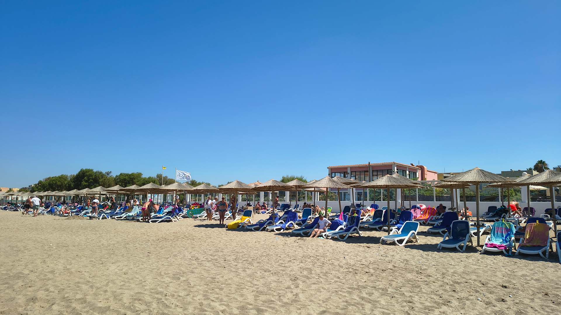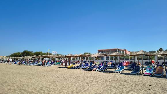 Blick vom Strand auf die hoteleigenen Liegen und das Hotel