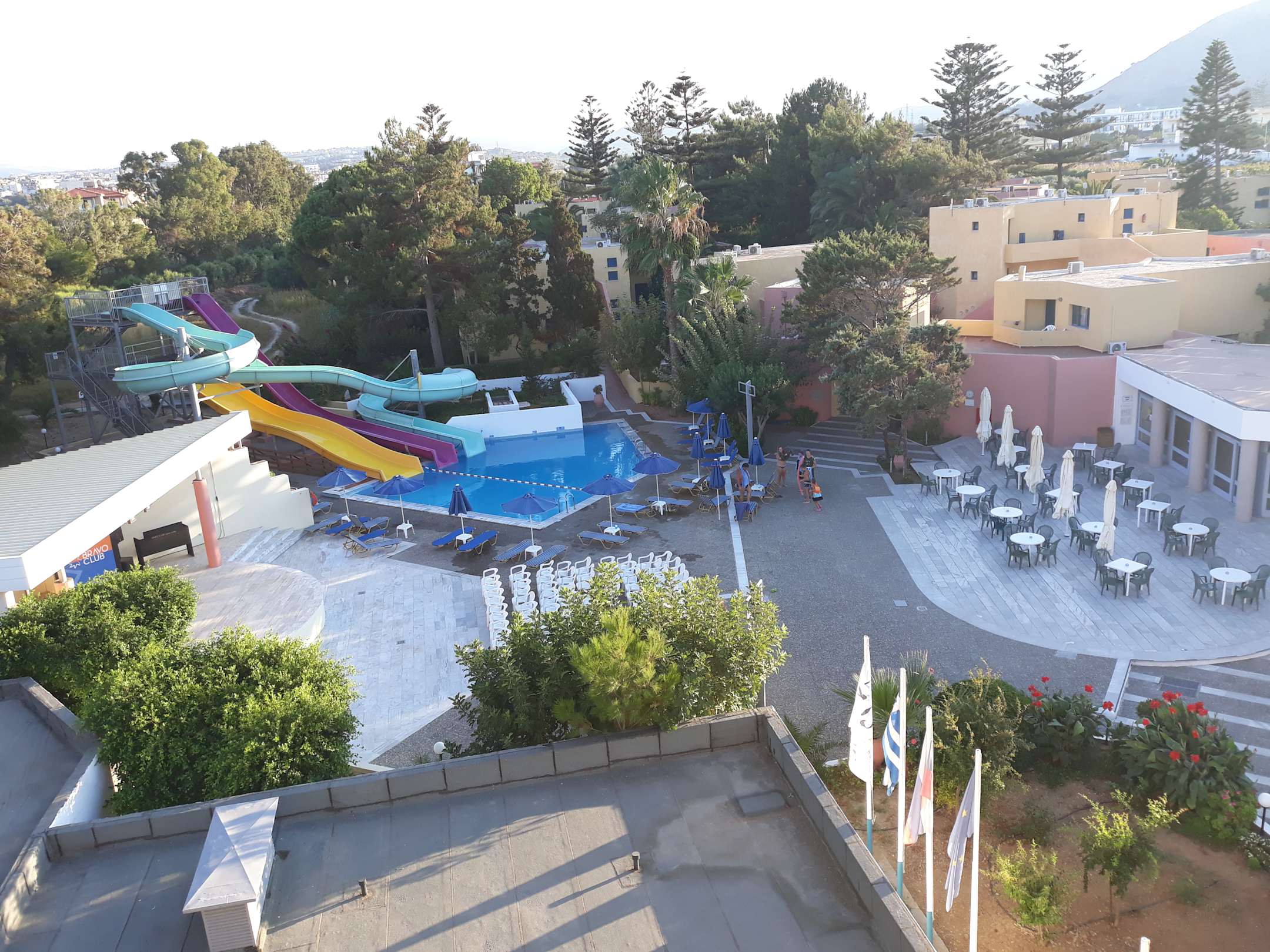 Anlage zwischen Hotelgebäude und dahinter liegender Bungalowanlage mit Showbühne, Doppelrutsche und 2. Poolbar (nur bei Veranstaltungen bewirtschaftet)