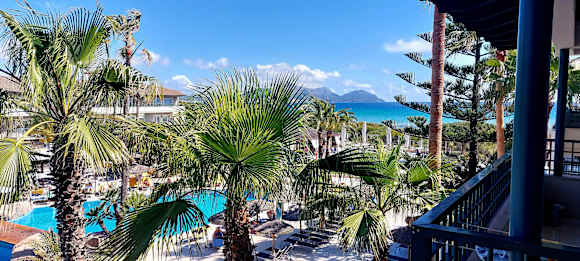 Blick vom Balkon über den Pool zum Meer