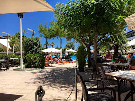 Blick vom Restaurant zum Pool