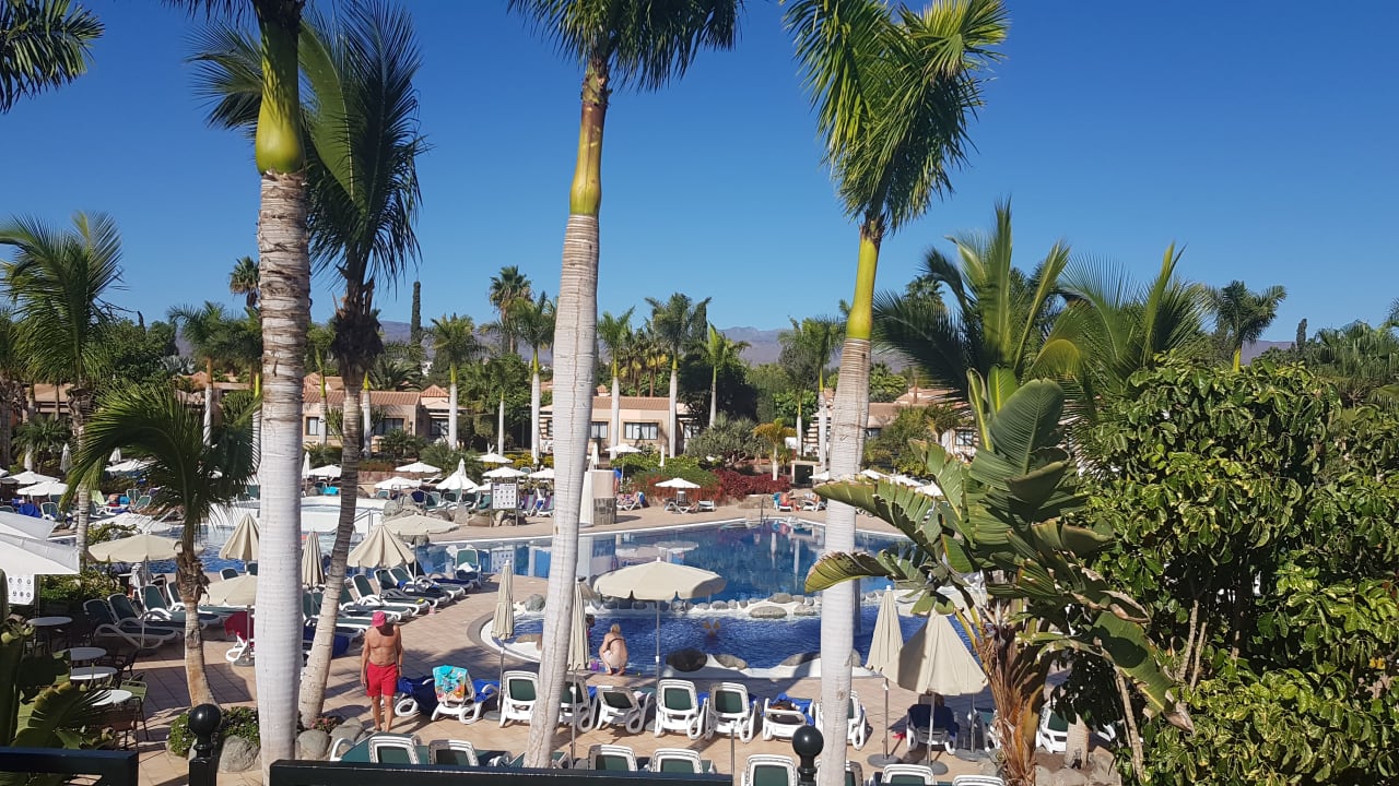 Ausblick von oben auf den Pool und Umgebung