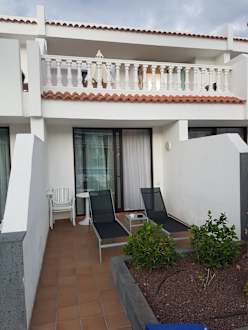 Terasse mit 2 Liegen und Sonnenschirm.