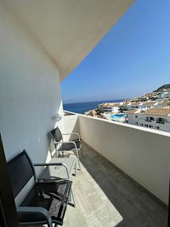 Blick auf den Balkon und die Bucht.
