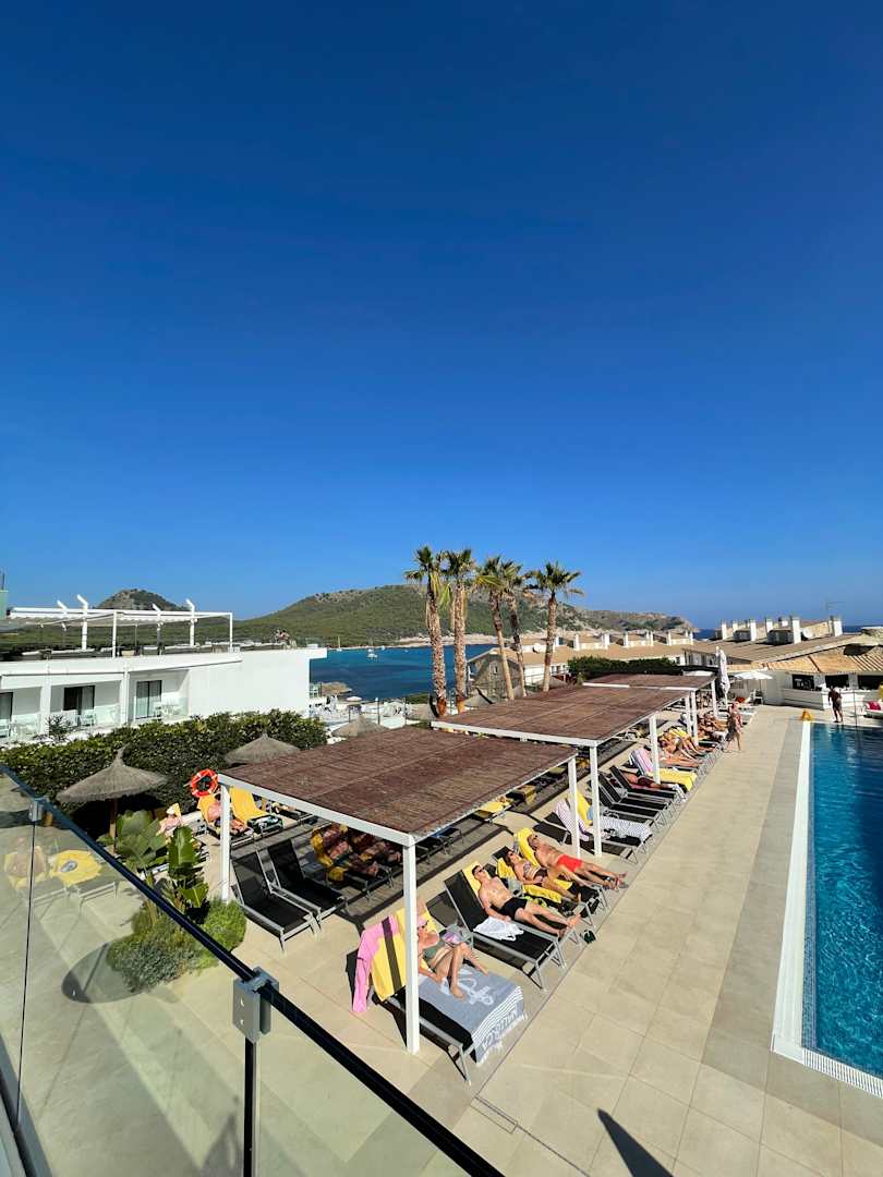 PoolBlick von der 3. Etage auf den Pool, den Liegebereich und das Nachbarhotel mit der Bucht im Hintergrund