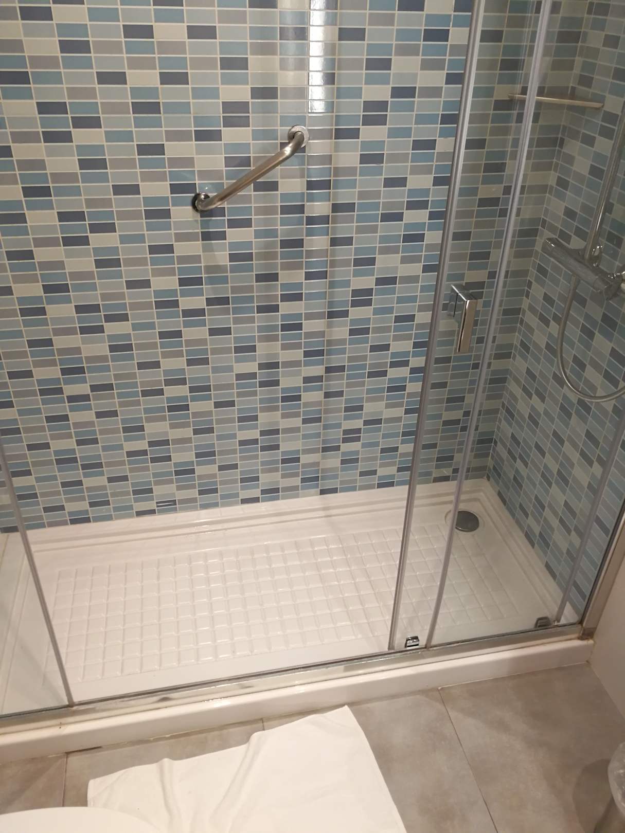Dusche mit der besagten einen Tür links die fehlt und durch wurde immer alles nass