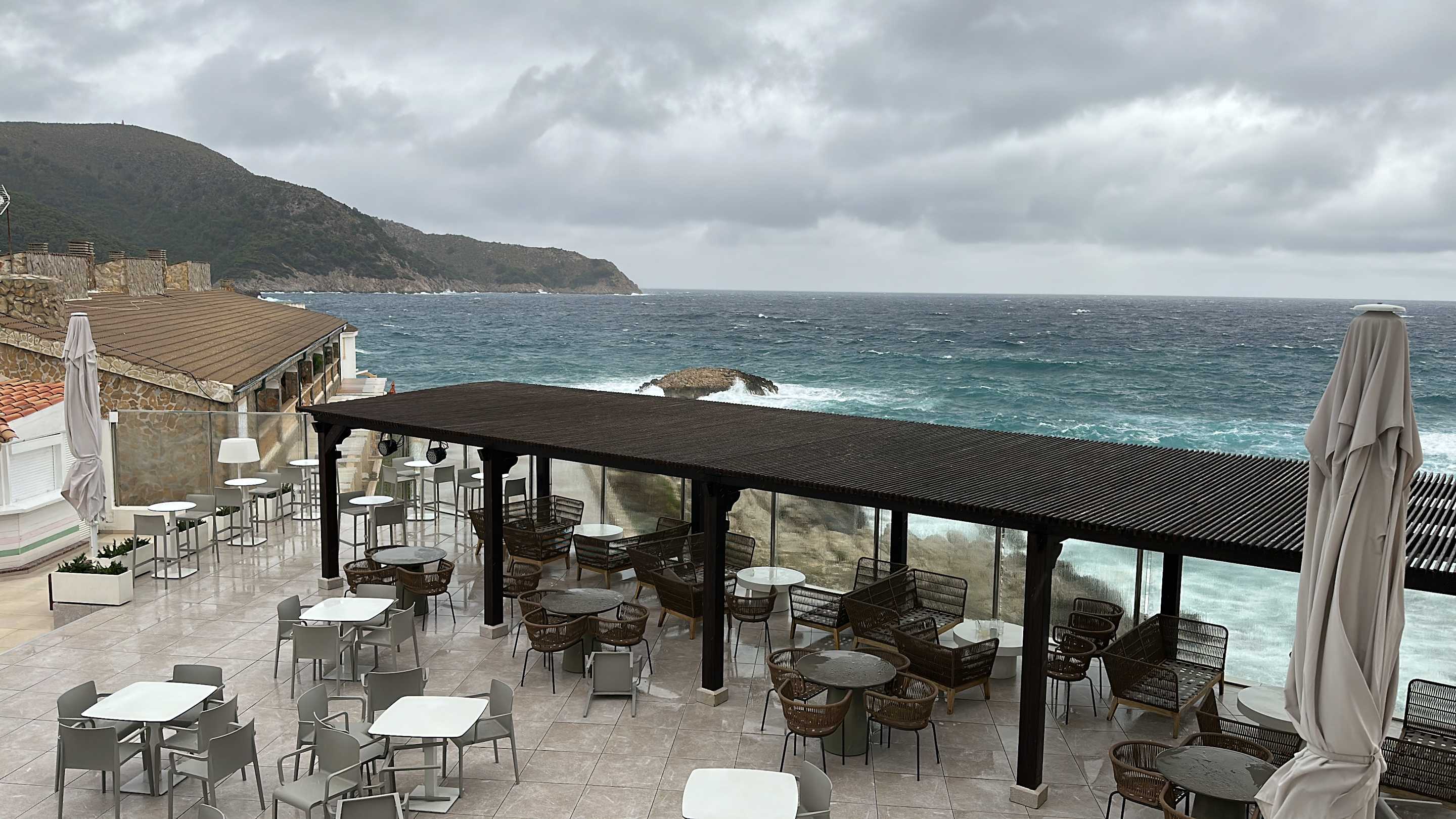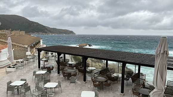 Ausblick von Balkon auf Außengastronomie
