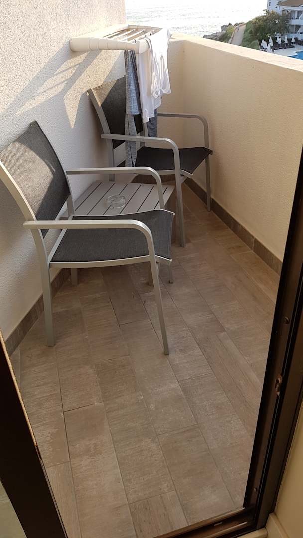 ZimmerBalkon eines Familienzimmers (542). Eigentlich stand dort noch ein 3. Stuhl, aber es war einfach zu eng. Vom halben Balkon wußten wir nichts.