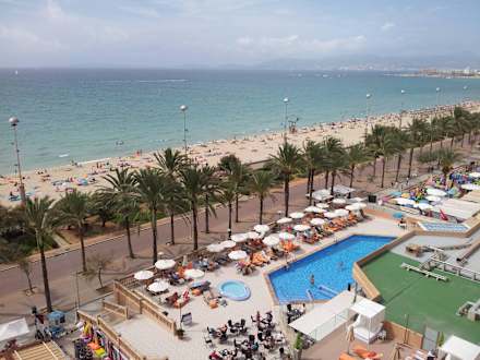 Blick vom Balkon auf Pool und Strand