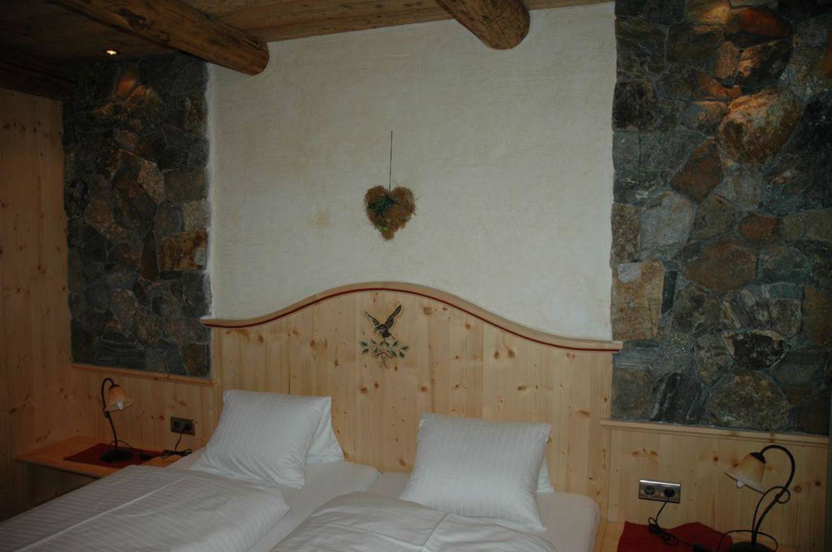 Holz an der Decke Naturstein an der Wand,toll, grosse Betten