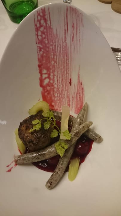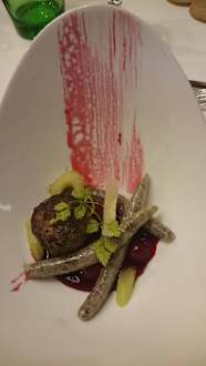 Fleischbällchen mit Mohnnudeln auf Kirschen