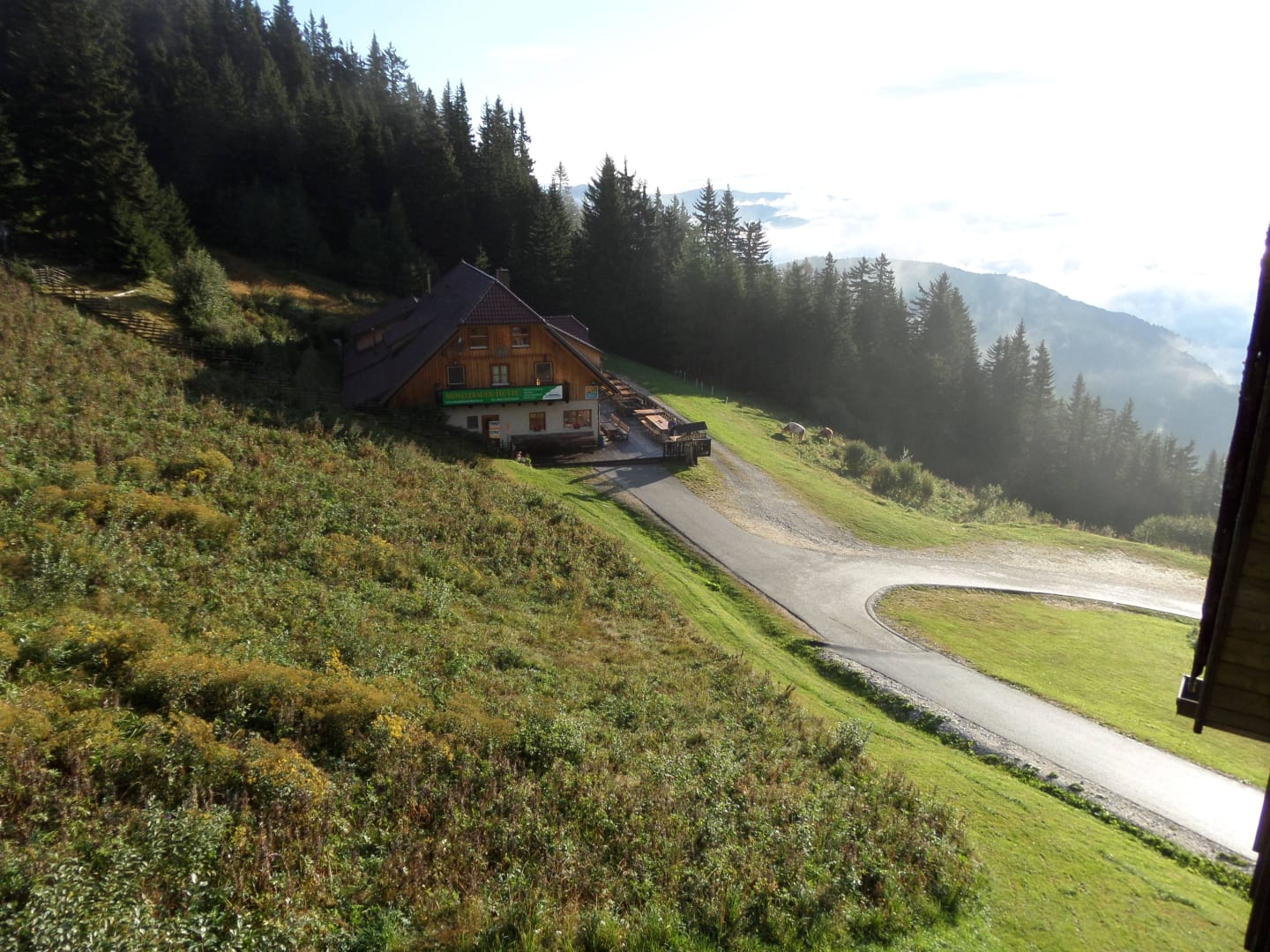 Haupthütte von der Wohnhütte aus gesehen