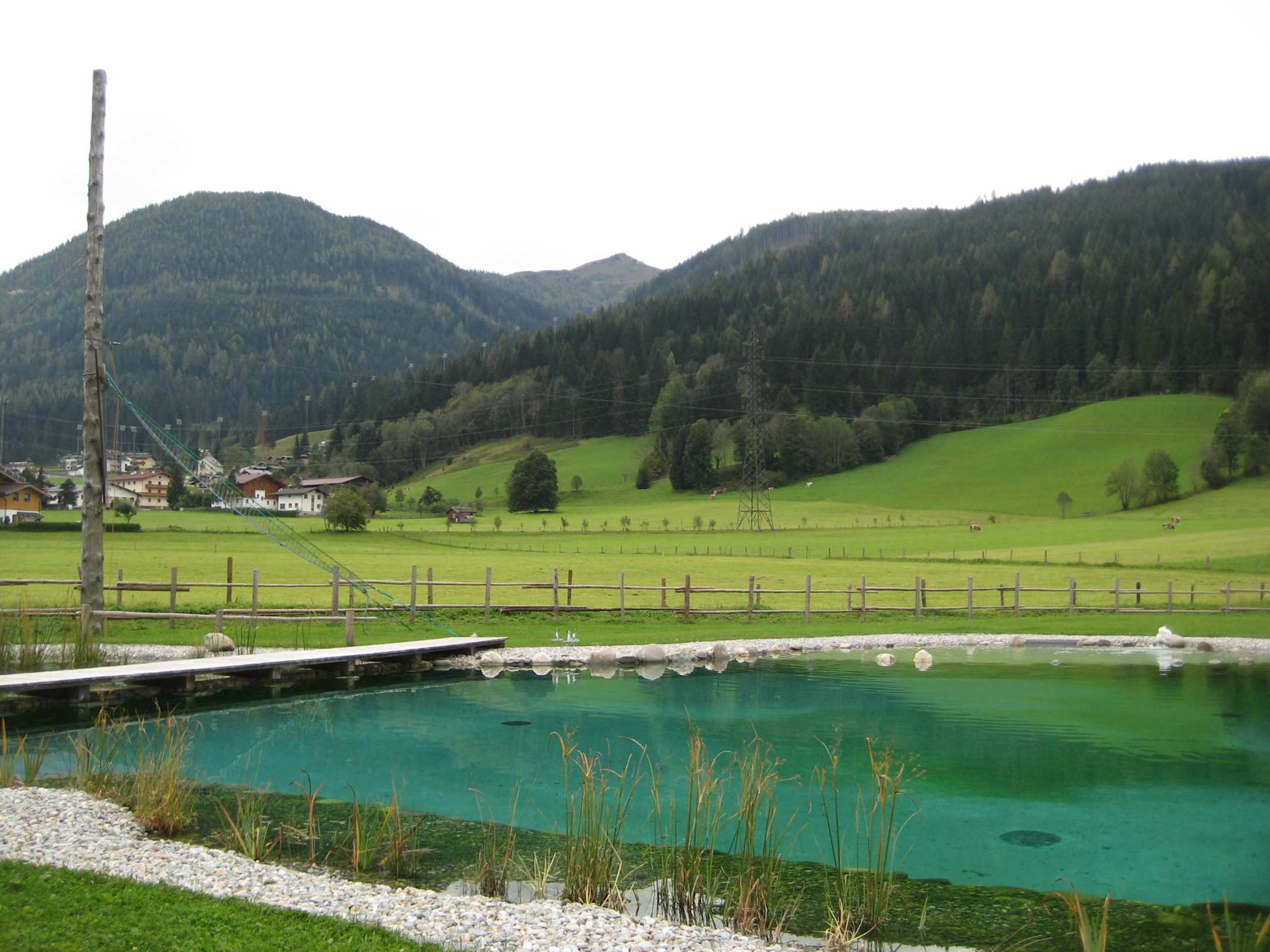 Blick über den Pool zum Hochseilgarten
