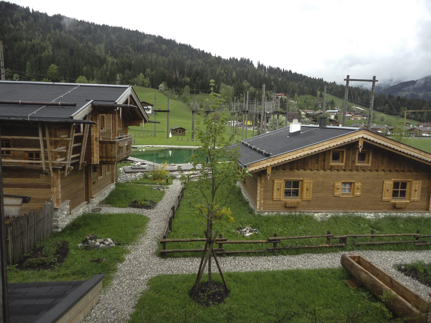 Blick auf den Schwimmteich und den Klettergarten