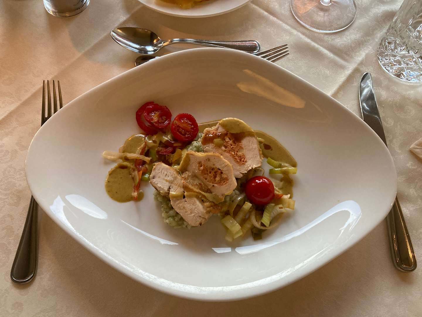 GastroGegüllte Brust vom Gourmethuhn, Almkräuterrisotto, Lauchgemüse, Cocktailtomaten, Curryschaum