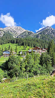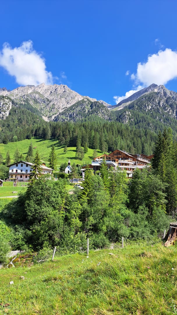 Aussicht auf das Hotel bei einer Wanderung zur Lackenalm