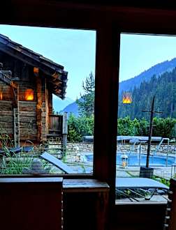 Ausblick aus dem Brennstadl auf den Whirlpool und die Hüttensauna