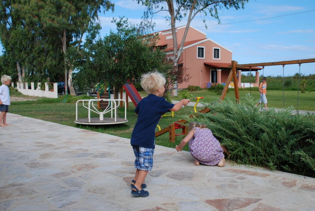 Spielplatz neben dem Restaurant-im Hintergrund das Appartmenthaus. Der Spielplatz war in einem guten Zustand und völlig ausreichend.