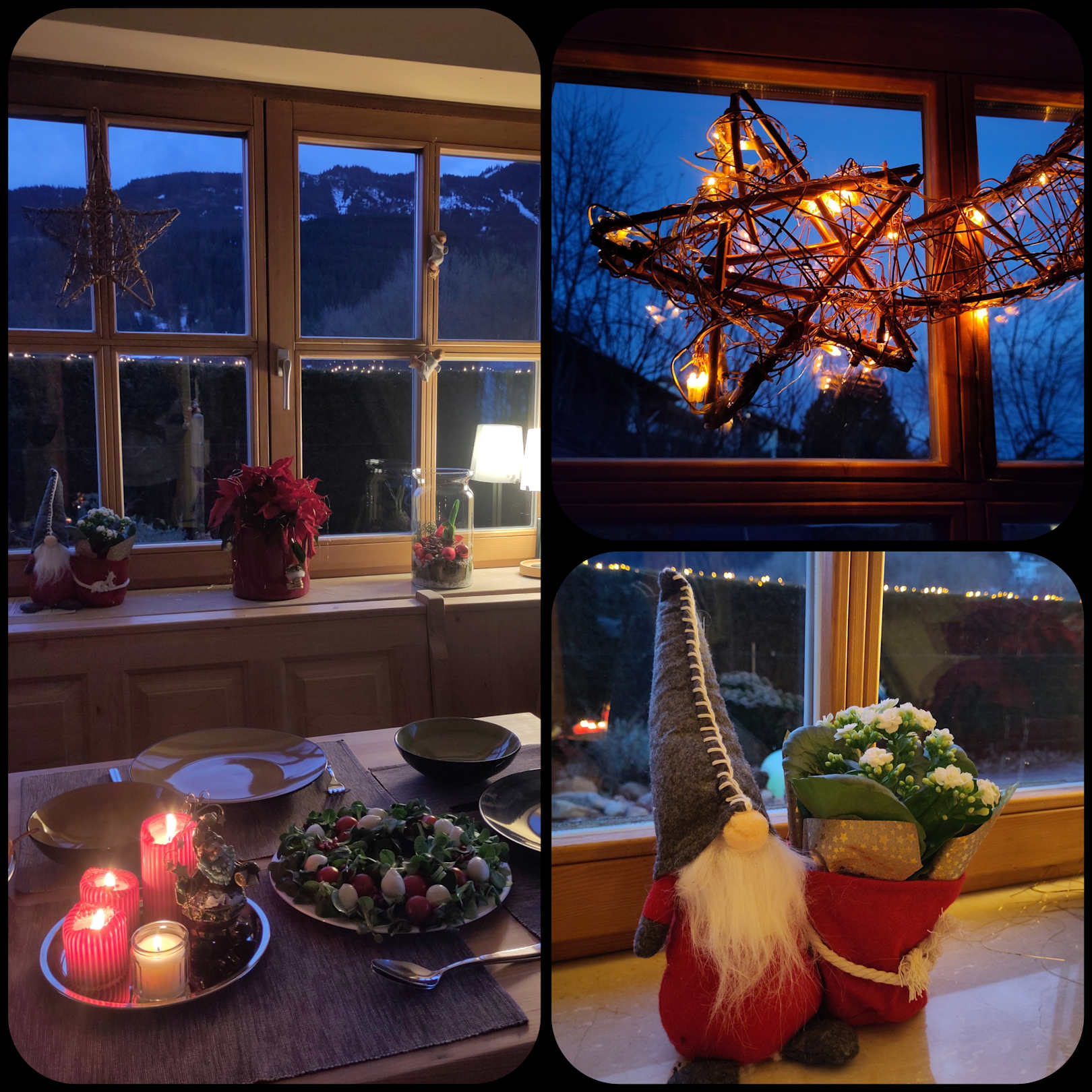 Vom Esstisch hat man einen schönen Blick in den Garten und auf die Berge. Auch für weihnachtliche Deko war gesorgt, wir waren begeistert von der Atmosphäre.