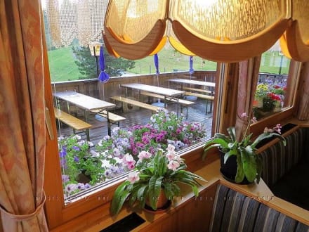 Blumenschmuck im Gastraum und an der Außenterasse