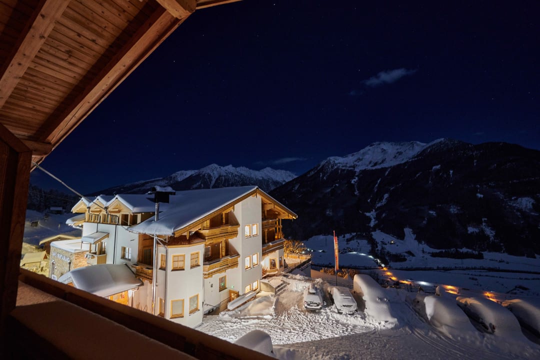 Blick bei Nacht aus dem Apartment auf den Alpengasthof Bergpanorama im Hintergrund.