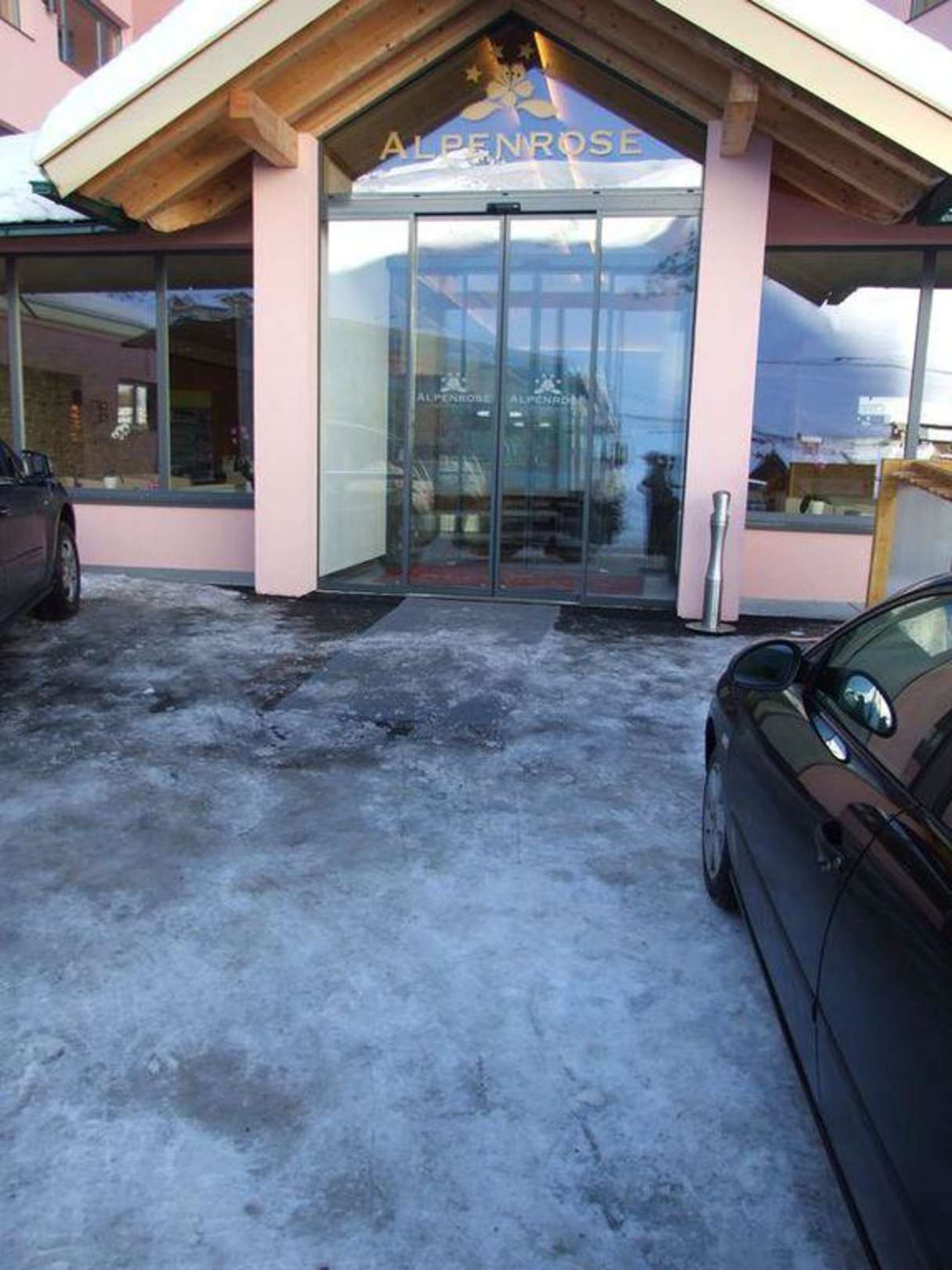 Gäste des Hotels reisen idealerweise mit Bergschuhen an. Foto zeigt den Haupteingang gegen 10 Uhr. Der Boden ist glatt.