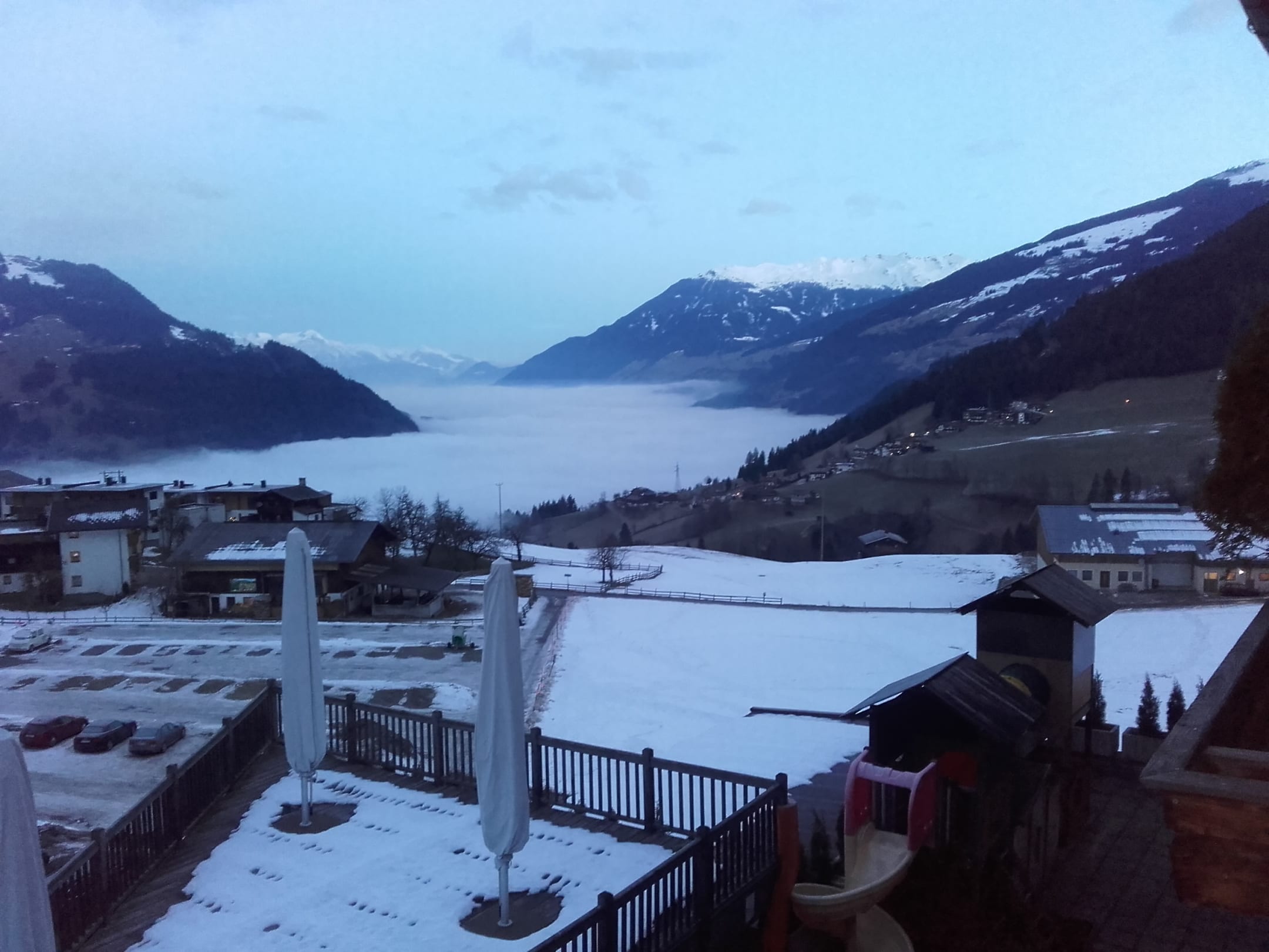 Ausblick vom Zimmer ins wolkenbedeckte Tal was für eine Ansi