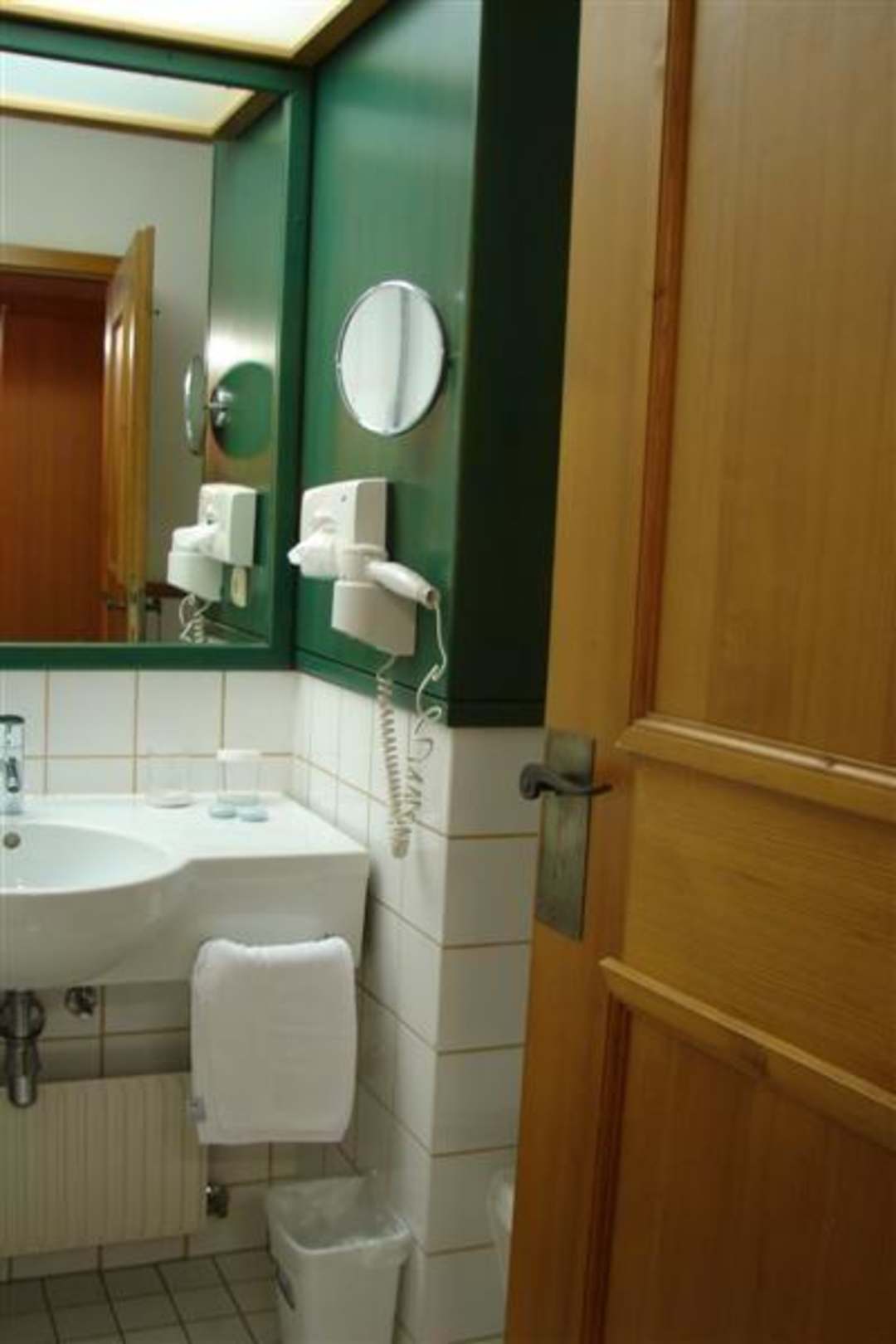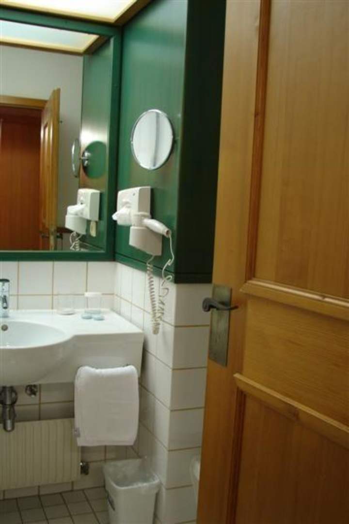 Blick ins Bad des Doppelzimmers mit Föhn und Schminkspiegel
