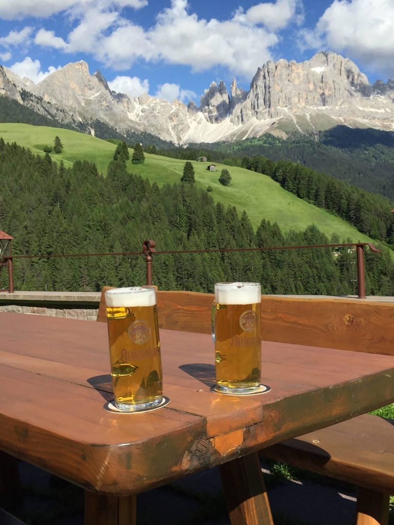 Besser kann man doch das verdiente Bier nach einer Wanderung nicht genießen, als hier im Gartenbereich des Alphotels Panorama mit Ausblick auf den Rosengarten! Prost!