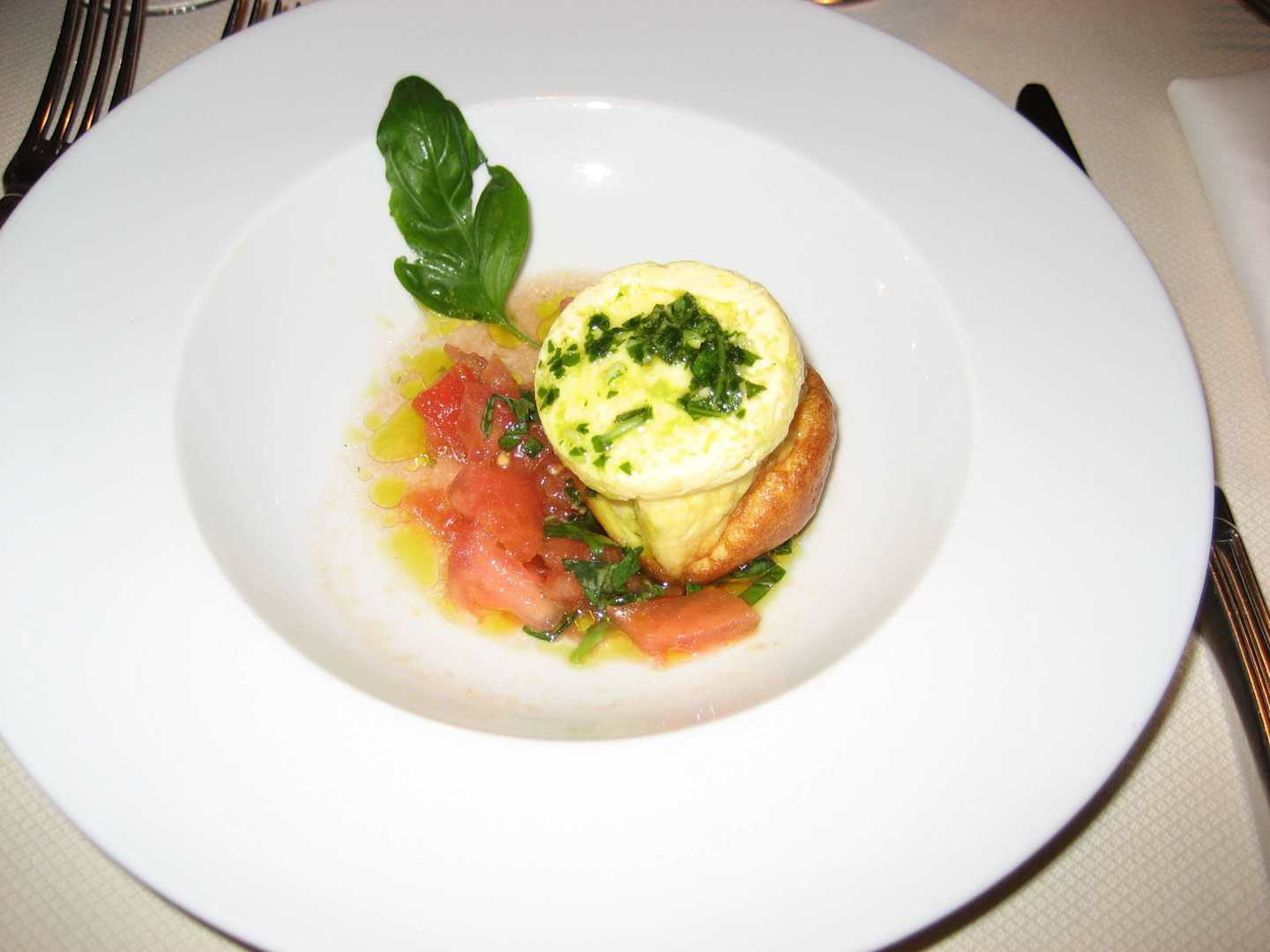 Käseflan mit Tomatenconcassé u. Basilikumdip