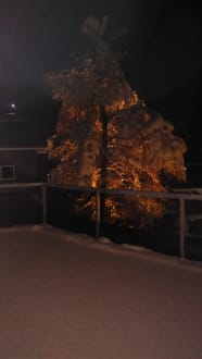 Blick auf die Terasse mit beleuchtem Baum