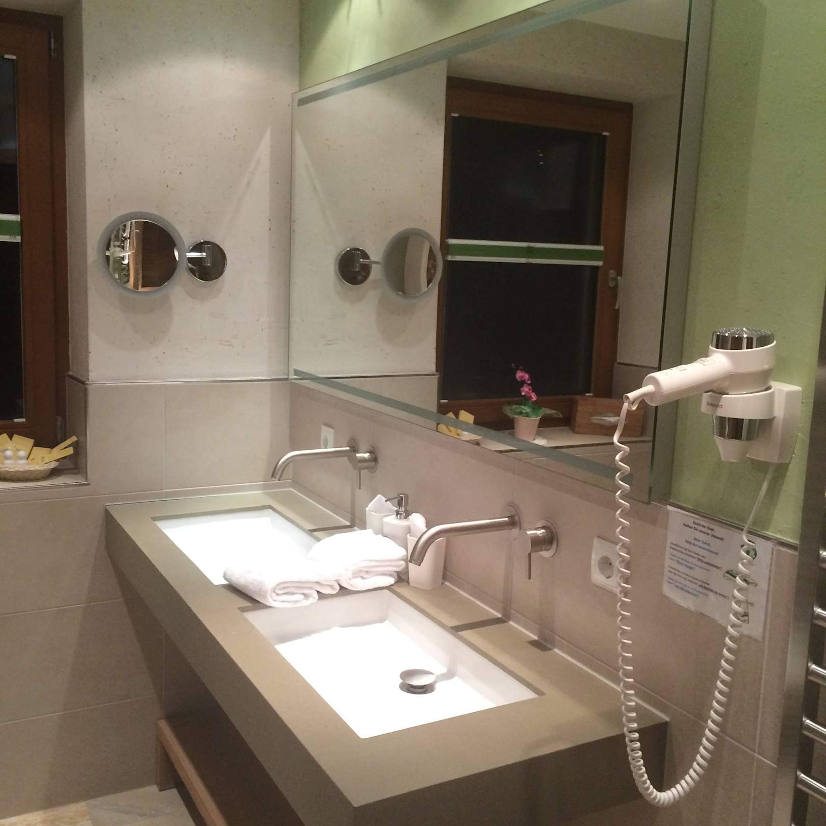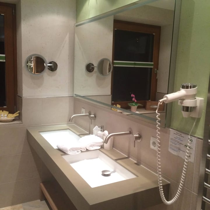 Doppelwaschbecken, alles neuwertig, alles funktioniert, alles sauber. Nicht im Bild: Großzügige Dusche mit Regenduschkopf und separater Handbrause