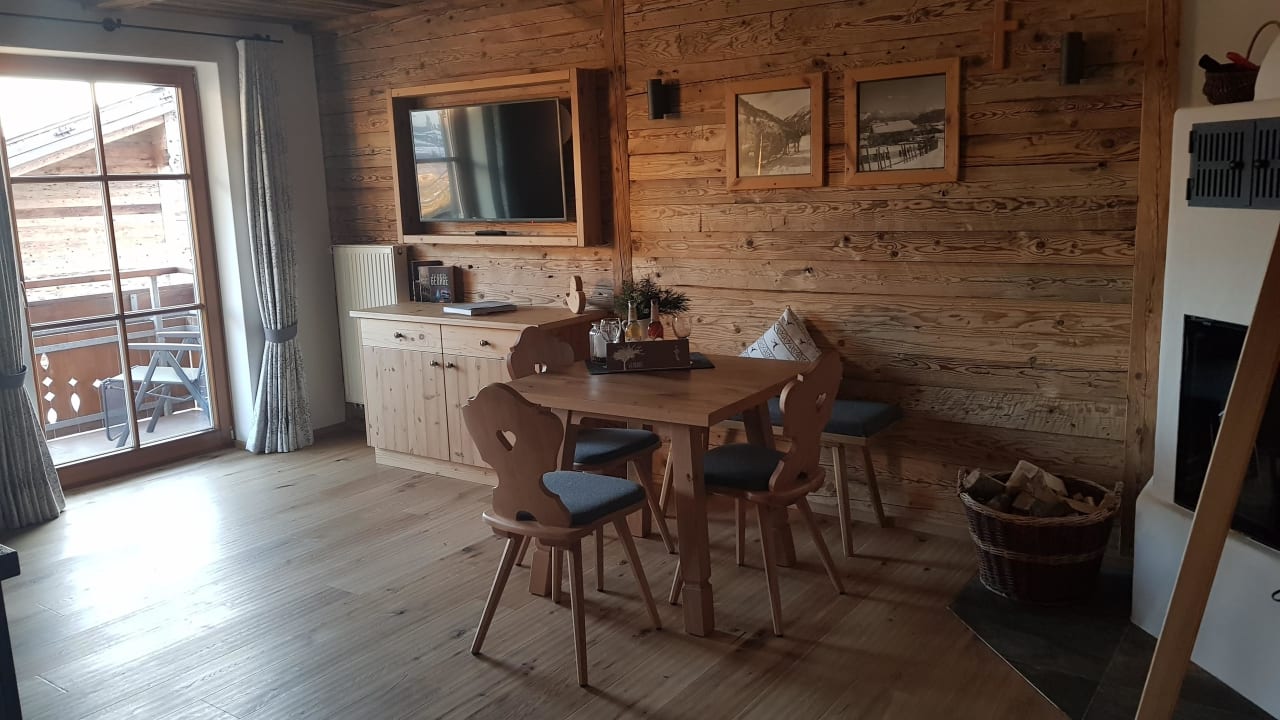 ZimmerWohnraum, mit TV und Esstisch. Ausgang zum Balkon, der ebenfalls mit Tisch und Stühlen ausgestattet ist.