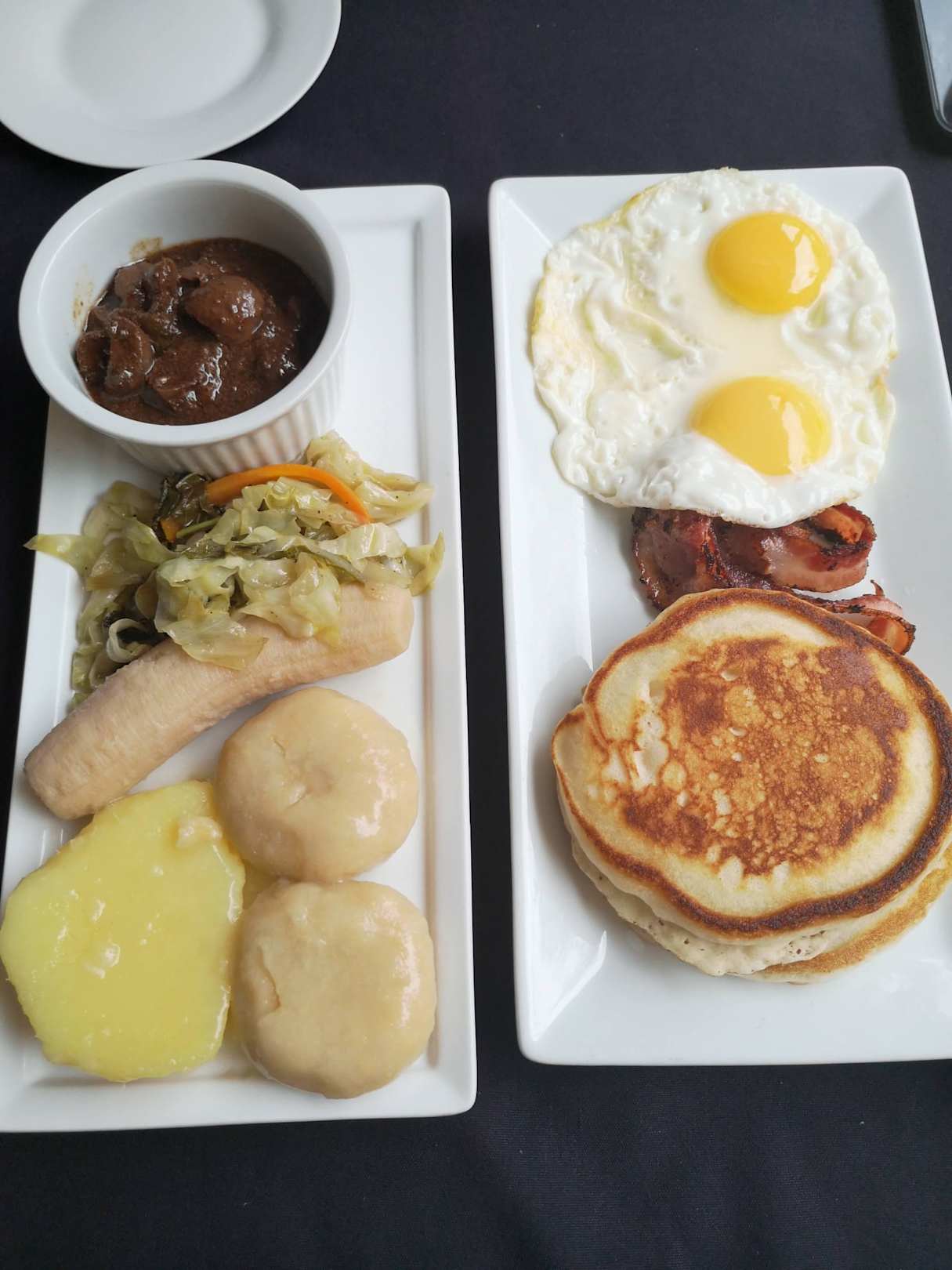 GastroDas Frühstück: Zur Wahl stehen ein jamaikanisches (jeden Tag wechselnd, links) und ein Continental (rechts, versch. Wahlmöglichkeiten)