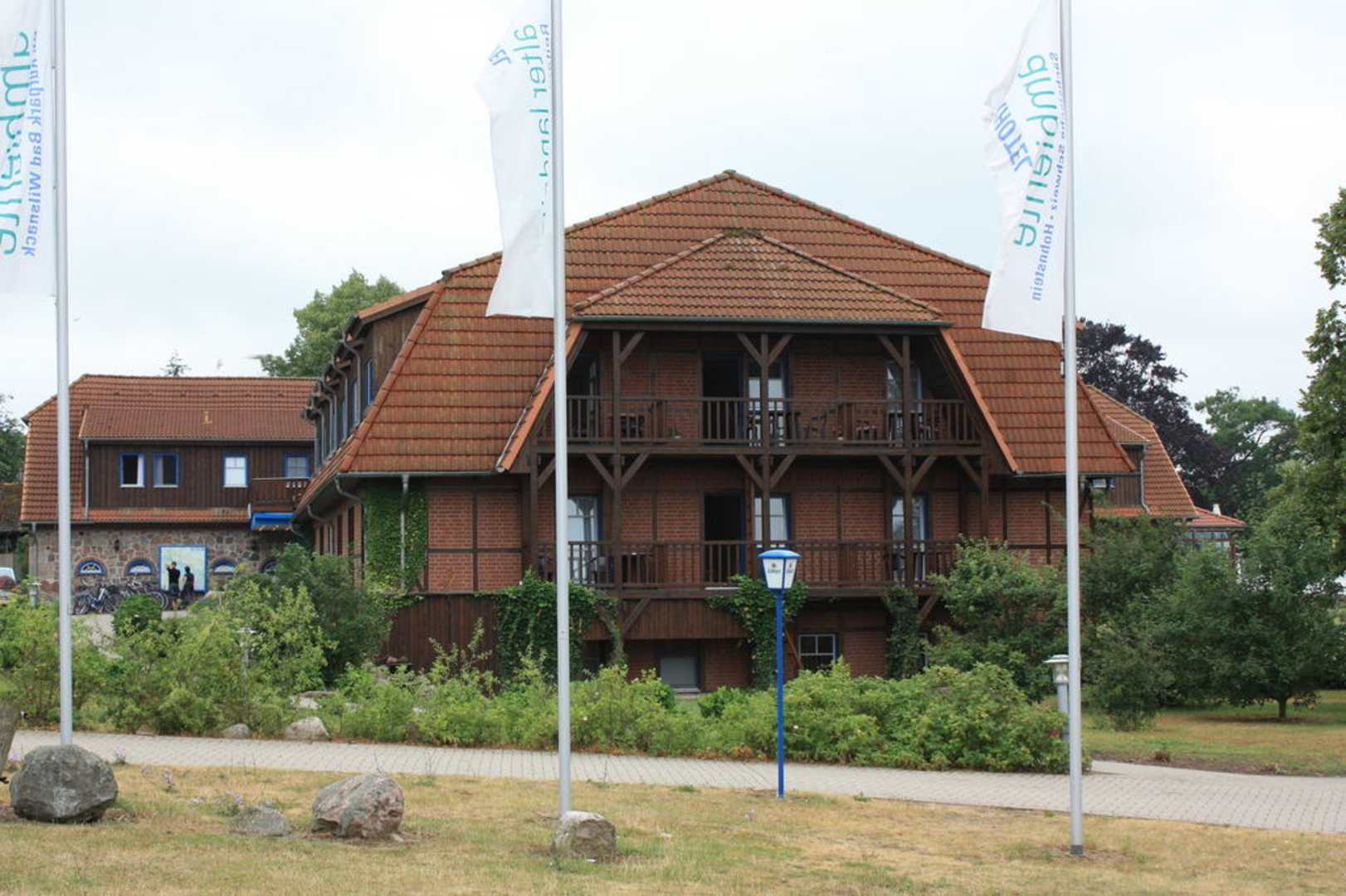 Blick auf die Nordseite. Vom Parkplatz aus aufgenommen. Es gibt 2 gemeinsame Balkons im EG und OG. Von den Zimmern aus schaut man auf den Parkplatz und die Stallungen.