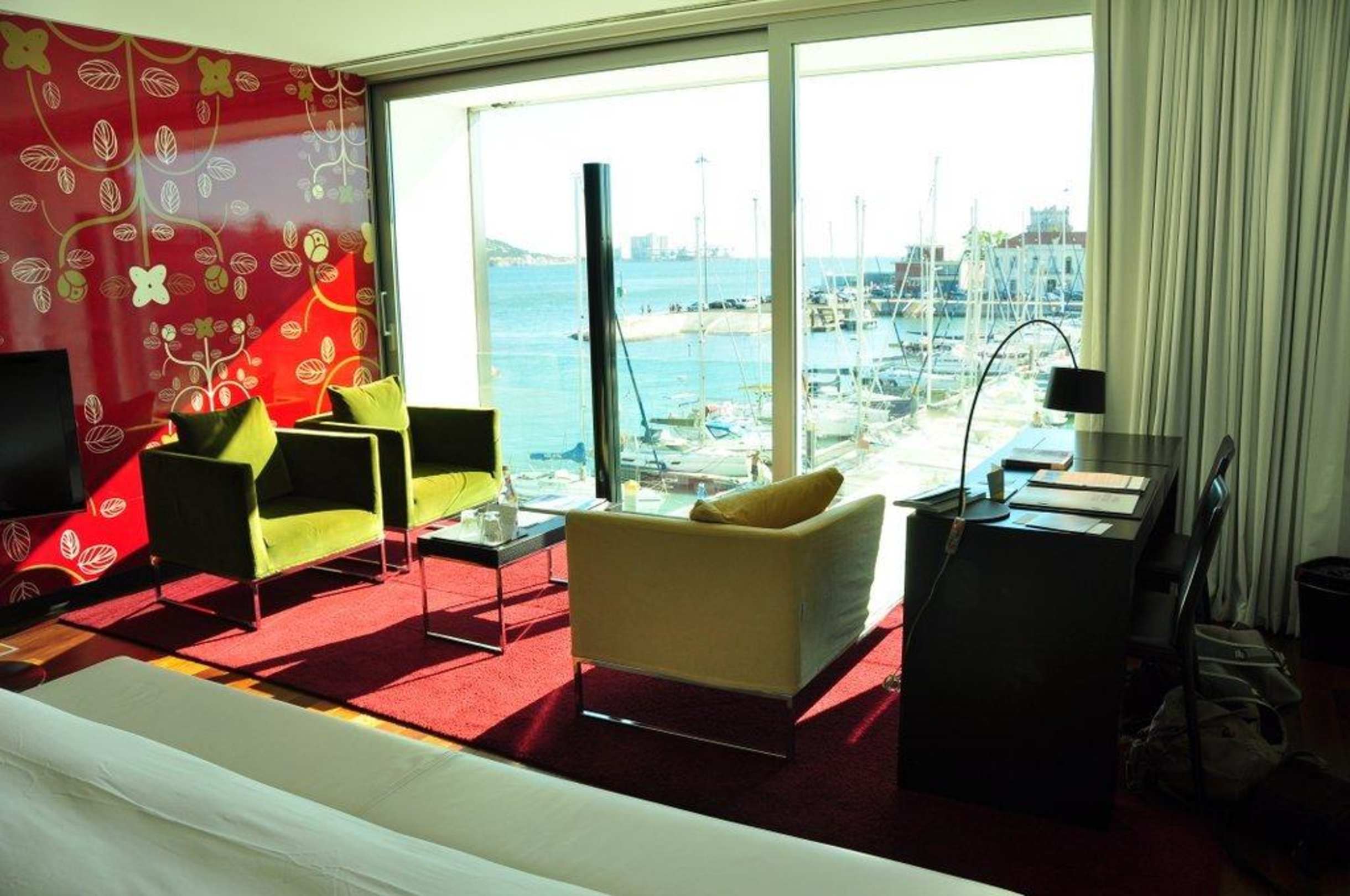 Deluxezimmer Altis BelemBlick vom Bett Richtung Fenster (Aussicht auf den Yachthafen und Fluss) Rote Wand mit Design des Zimmer "Goa"