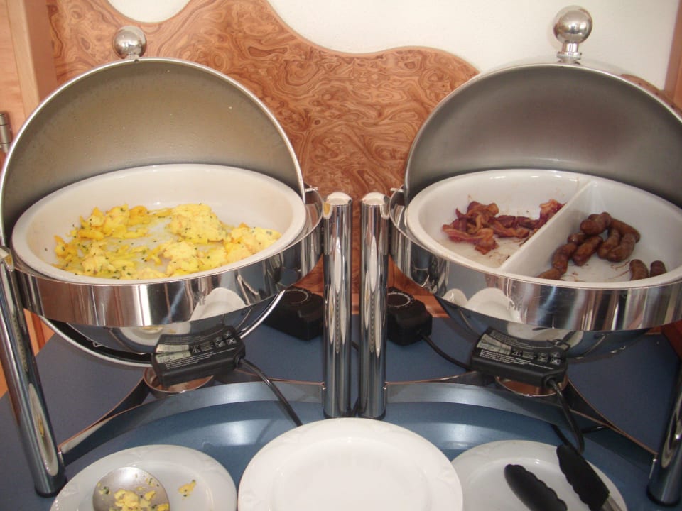 Frühstücksbüffet. Hier: Eier und Würstchenauswahl.