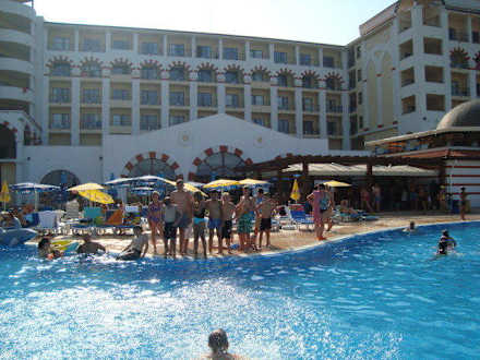 Blick vom Pool auf das Hotel