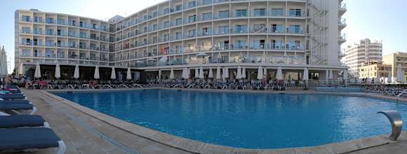 Blick vom Pool zum Hotel